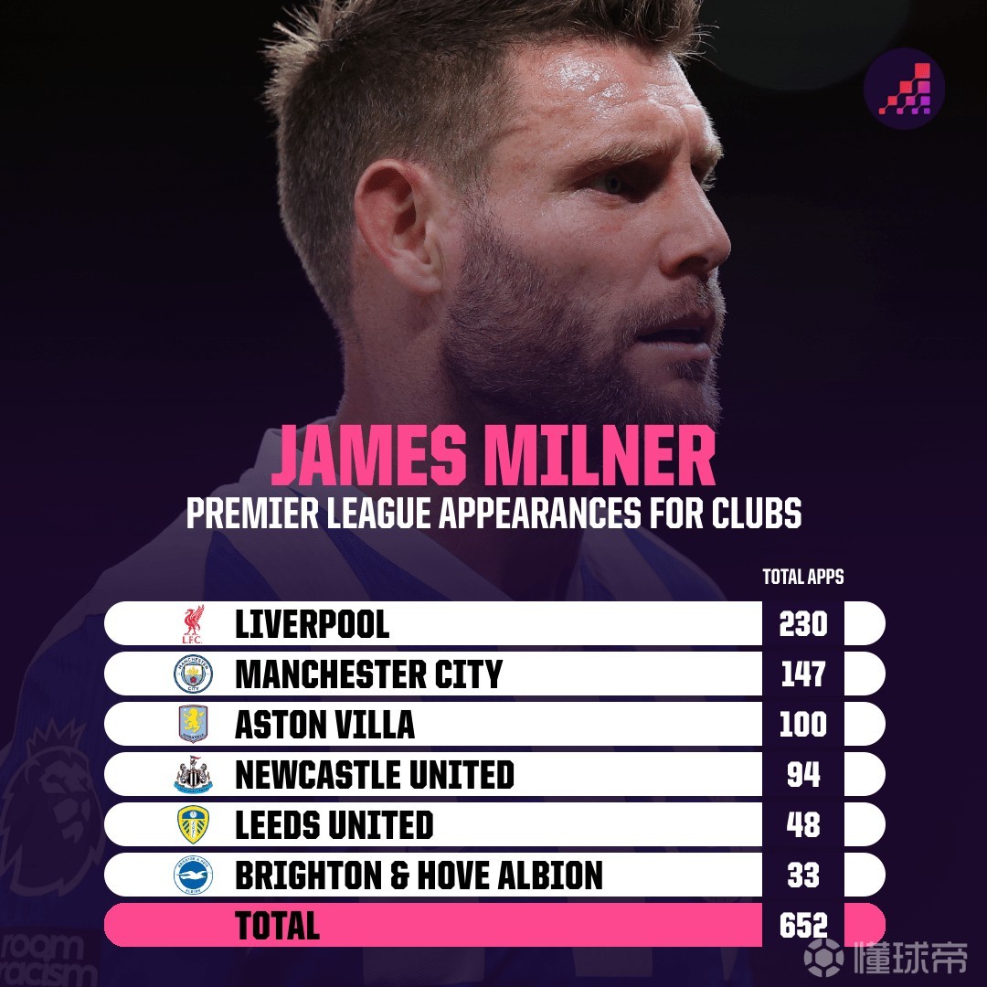 • 只差一场,米尔纳将追平巴里保持的英超历史出场纪录
