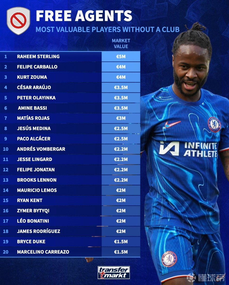 德转列自由球员身价榜:斯特林500万欧第1,林加德、J罗上榜