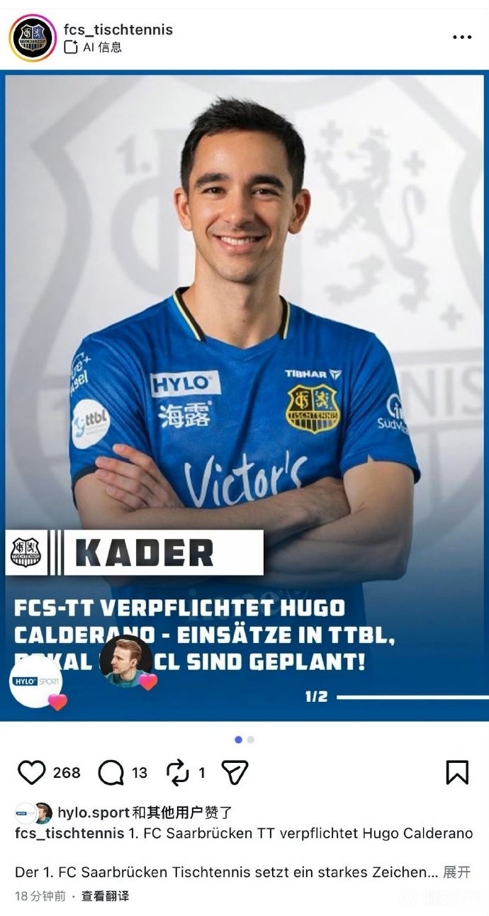 雨果加盟德甲萨尔布吕肯俱乐部,与樊振东成为队友