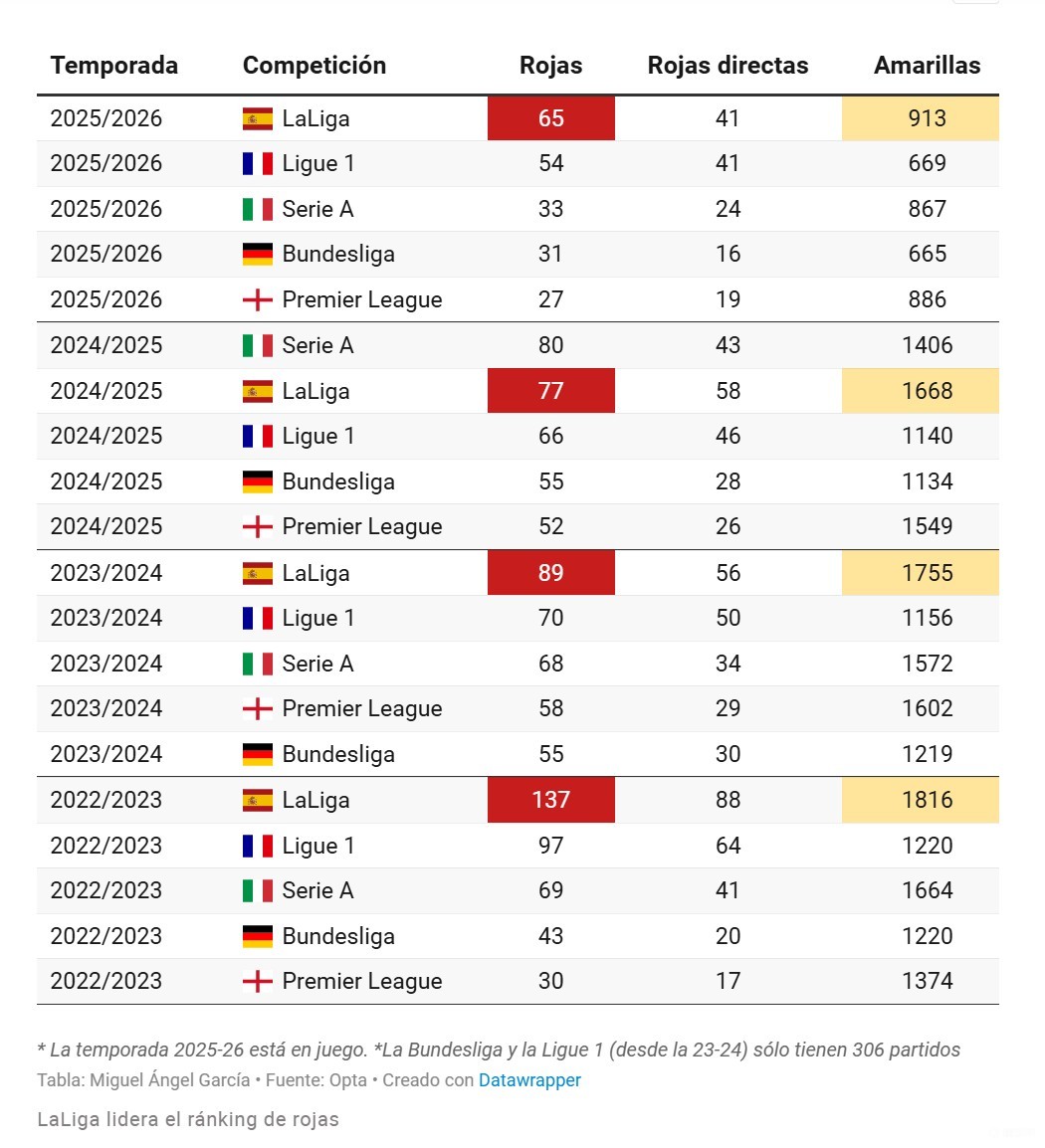 最能左右比赛走势的直接红牌,同样指向西班牙。西甲目前的65张红牌中,有41张为直接红牌,这一比例在欧洲范围内偏高。法甲直接红牌数量与之相同,但比赛场次和总赛程均更少。